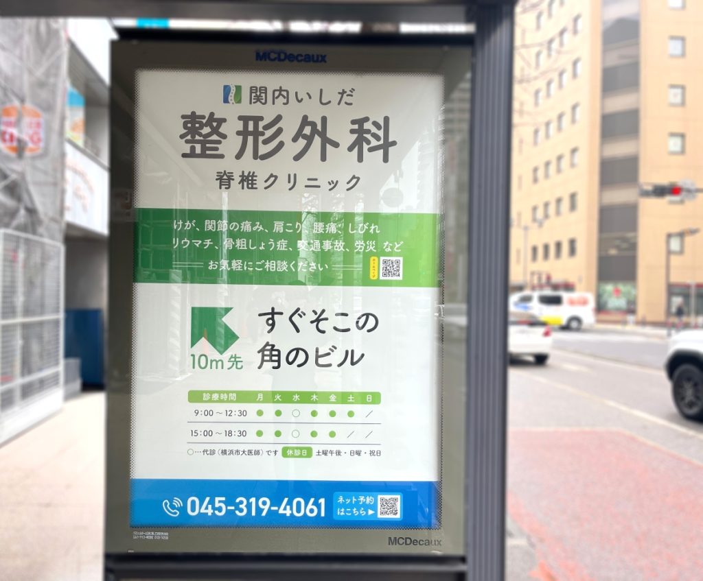 横浜市にあります「関内いしだ整形外科・脊椎クリニック」様のバス停広告を制作させていただきました。